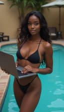 "black woman working on laptop by a tropical poolside"