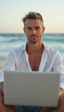 "white man with a laptop enjoying a beachside setting"