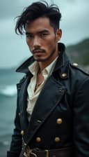 "halloween asian man dressed as a pirate with a stormy sea behind him"