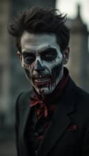 "halloween european man with zombie makeup in an eerie graveyard"
