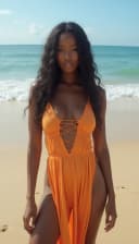 "black woman in a flowing summer dress on a sunny beach"