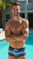"white man in swim trunks lounging by a bright blue pool"